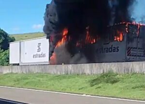 Uma carreta que transportava geladeiras foi atingida por um incêndio na tarde desta terça-feira (24), no km 118 da BR-101,...