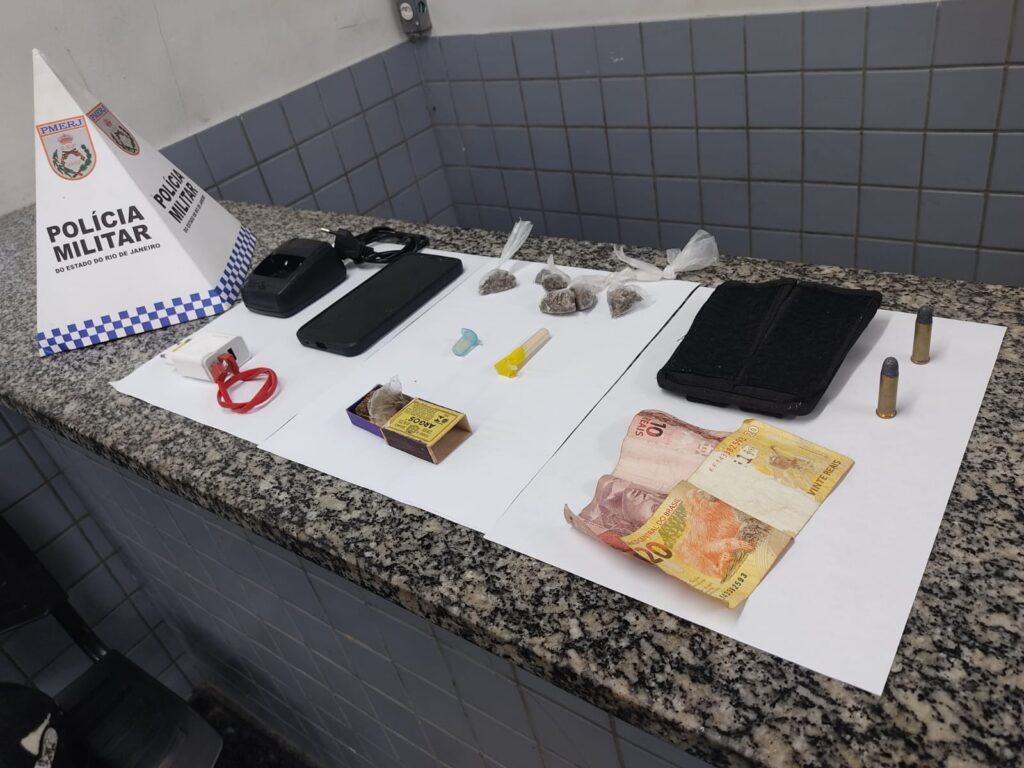 Na casa, os policiais encontraram 07 buchas de maconha, 02 pinos de cocaína, 02 munições intactas de calibre 38, R$ 30 em espécie, uma base de carregador para rádio transmissor, um porta carregador de pistola duplo, um celular e um carregador.