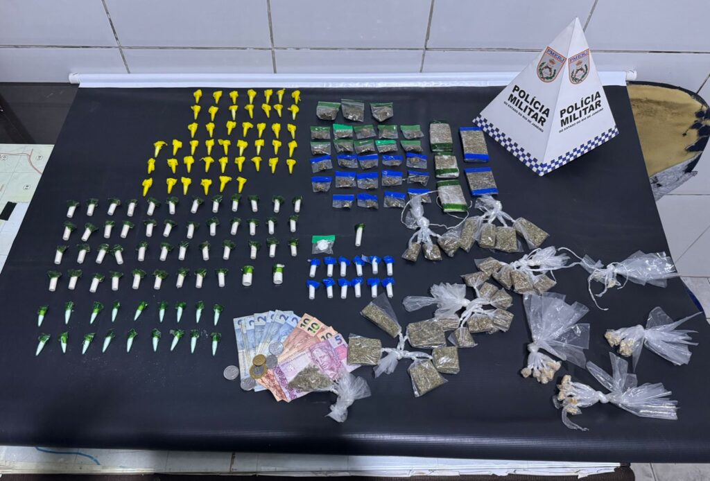 Durante patrulhamento pela região, os agentes avistaram um suspeito que, ao notar a presença da viatura, fugiu do local e não foi alcançado. Na tentativa de despiste, ele abandonou uma sacola contendo 53 buchas de maconha, 5 pequenos tabletes da mesma droga, 29 pedras de crack, 123 pinos de cocaína, além de R$ 56,00 em dinheiro.