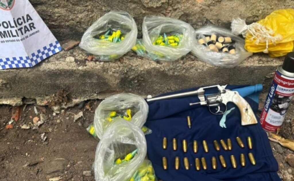 Durante a varredura no local, os policiais encontraram, sobre a laje do banheiro, um revólver calibre 32 e duas munições do mesmo calibre, além de 20 munições de calibre .40.