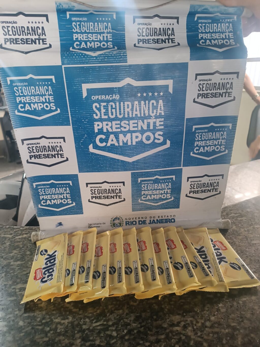 Na revista pessoal, os agentes também encontraram com o suspeito 10 barras de chocolate da marca Galak, da Nestlé. Ele confessou ter furtado os produtos de uma unidade do supermercado Super Bom, localizada na Avenida Alberto Torres.