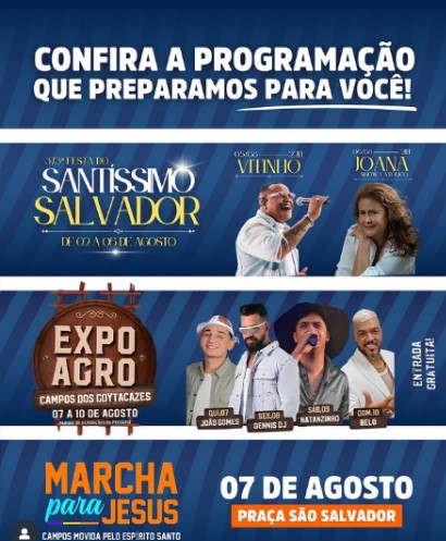 No mesmo dia da abertura da ExpoAgro, será realizada a Marcha para Jesus, um dos maiores eventos religiosos evangélicos da cidade. Com o tema “Campos movida pelo Espírito Santo”, a concentração acontecerá na Praça São Salvador, unindo fé, louvor e comunhão.
