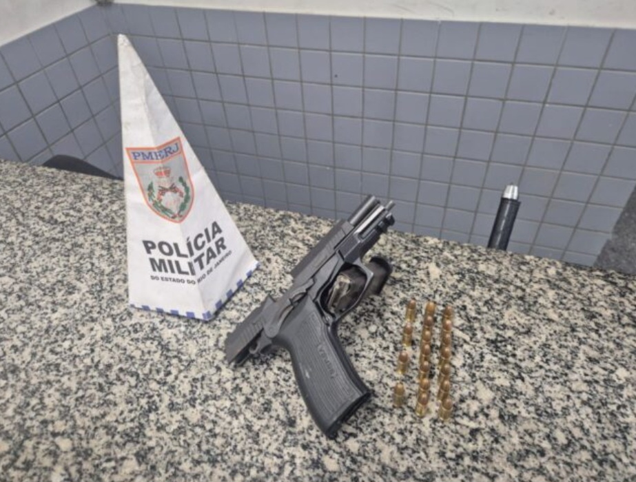 Segundo a Polícia Militar, o suspeito foi visto portando uma arma de fogo. Ao notar a aproximação da guarnição, tentou fugir por um beco e arremessou a pistola sobre o telhado de uma residência, mas acabou detido.
