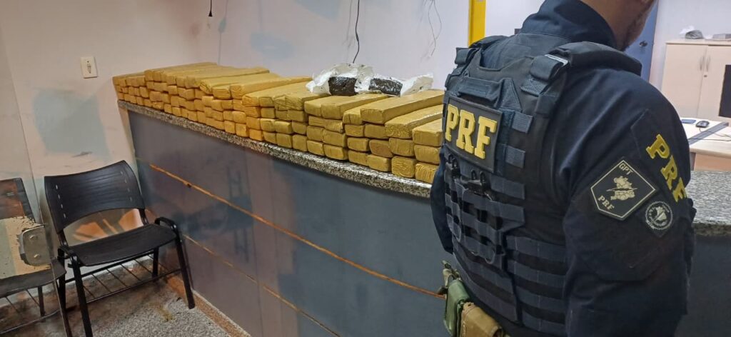 Na verificação do porta-malas, os policiais localizaram cinco fardos contendo 98 tabletes de maconha, totalizando cerca de 104 kg, além de dois tabletes de haxixe, somando aproximadamente 200 g. Também foram apreendidos dois celulares e o veículo utilizado no transporte.