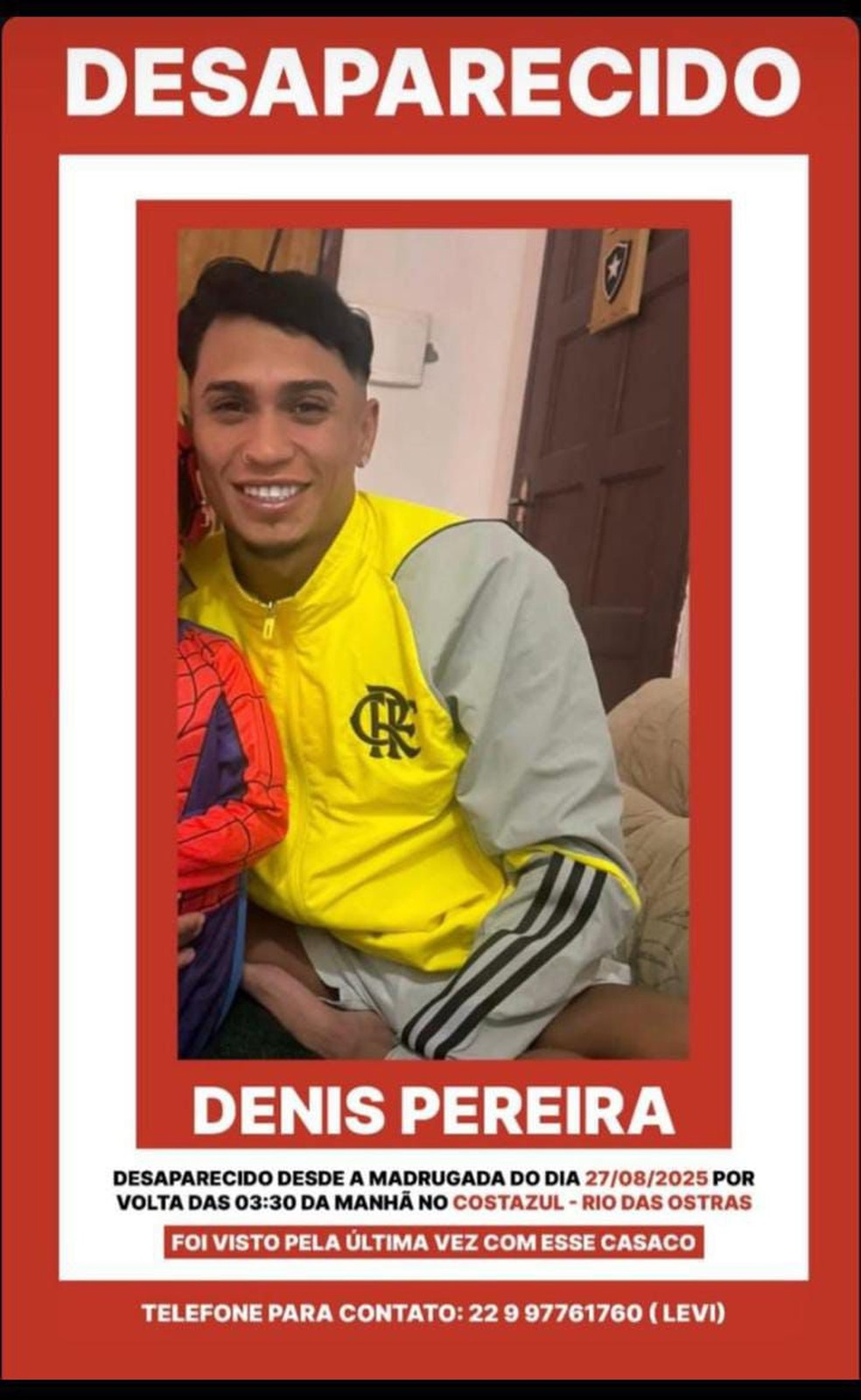 Amigos disponibilizaram o telefone (22) 99776-1760 para quem tiver informações sobre o paradeiro de Denis Pereira.
