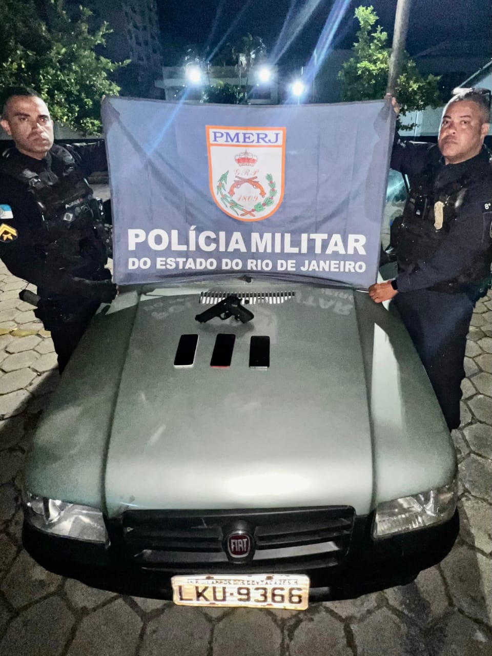 Os suspeitos foram abordados em frente à Drogaria Tamoios, na Pelinca. Durante a revista pessoal, nada de ilícito foi encontrado. No entanto, na busca veicular, os agentes localizaram um simulacro de arma de fogo, um celular roubado — reconhecido pela vítima, que esteve no local — e outros dois aparelhos pertencentes aos acusados.