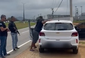 Durante monitoramento na Linha Azul, próximo ao Trevo das Bandeiras, policiais civis identificam um Chevrolet Onix branco, alvo de suspeita, sendo realizada a abordagem.