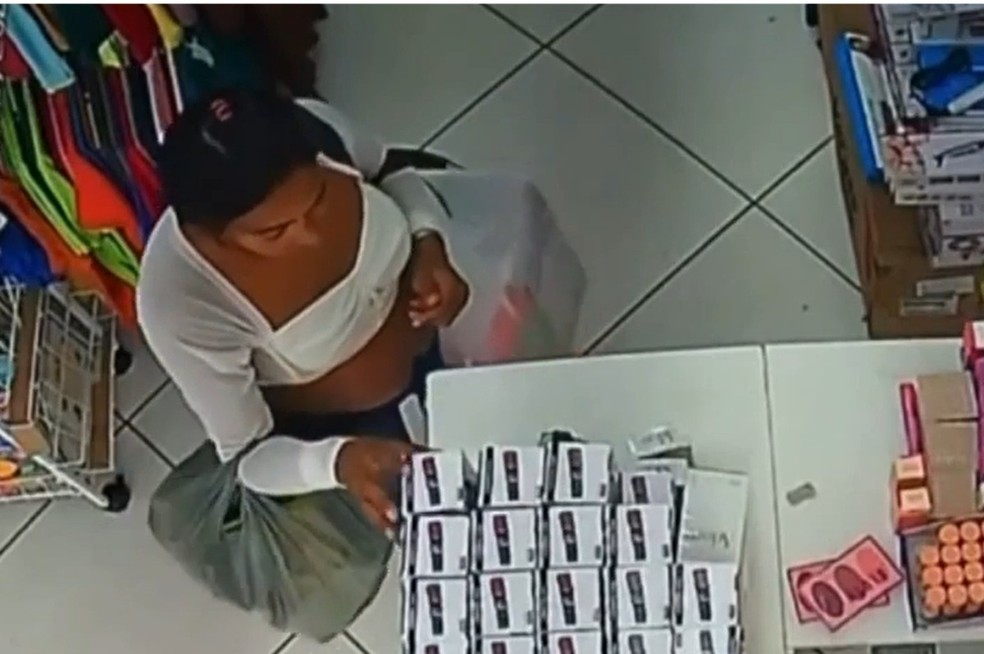 Imagens do circuito interno de segurança mostram uma mulher, vestindo uma blusa branca, furtando alguns produtos e colocando-os dentro de uma sacola.