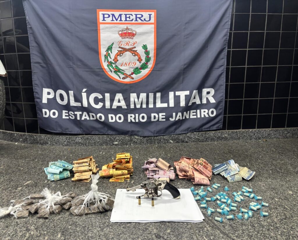 Durante a revista, foram encontrados R$ 3.604,75 em espécie, 54 pinos de cocaína, 46 buchas de maconha, um revólver calibre .32 da marca Smith & Wesson (nº 437666) e duas munições intactas do mesmo calibre.