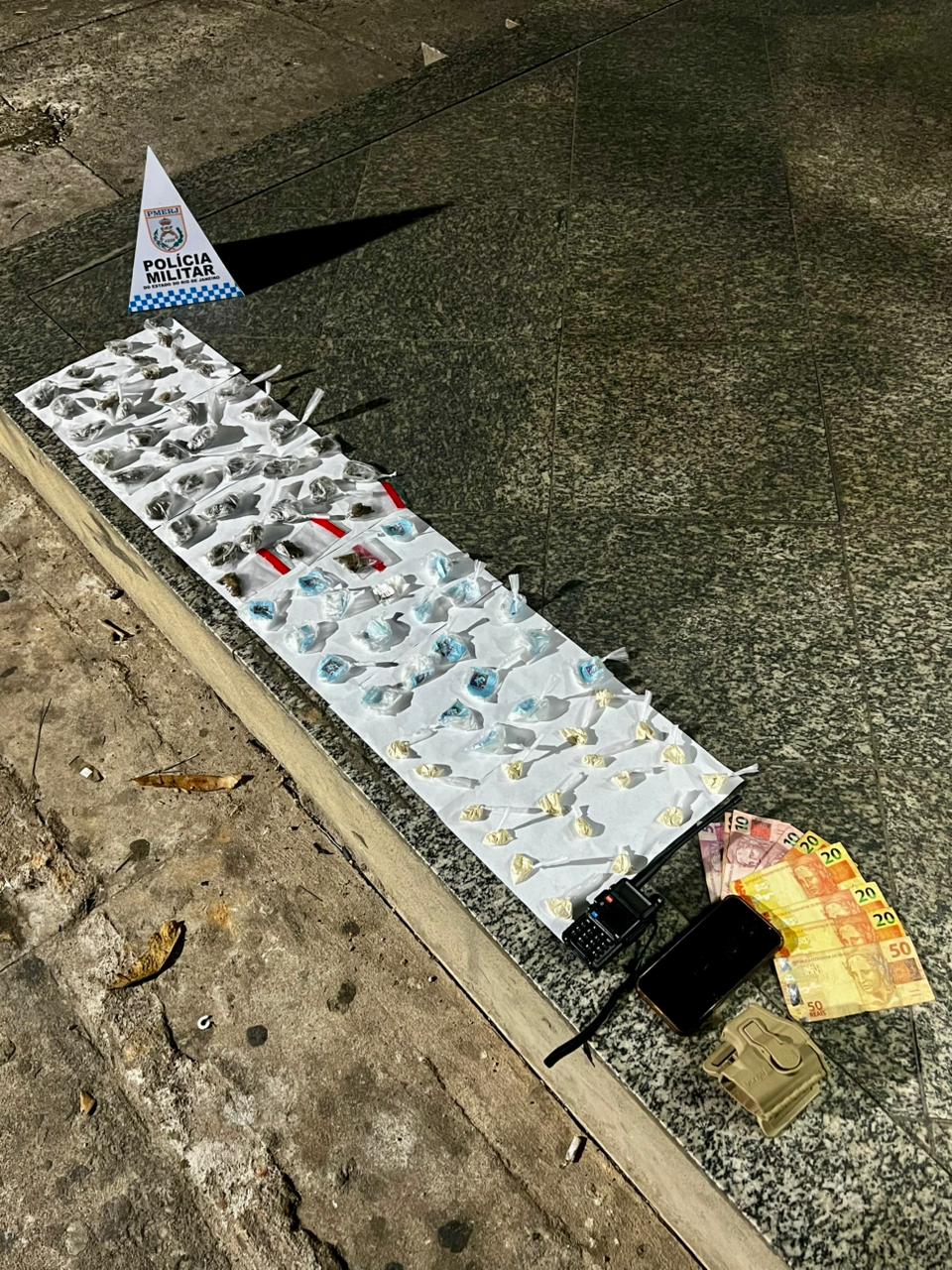 Na busca realizada dentro do carro, os policiais encontraram uma sacola contendo um rádio comunicador, um coldre, 41 buchas de maconha, 18 sacolés e 21 papelotes de cocaína.