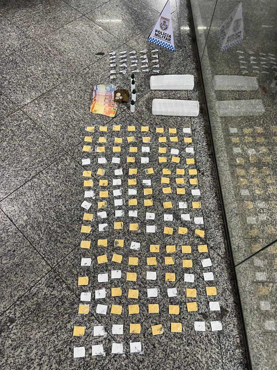 Durante buscas no ponto onde os criminosos atuavam, os policiais encontraram dois tabletes de maconha, totalizando cerca de 2 kg, 132 papelotes e 26 pinos de cocaína, quatro frascos de uma substância semelhante a “loló”, além de R$ 78 em espécie.