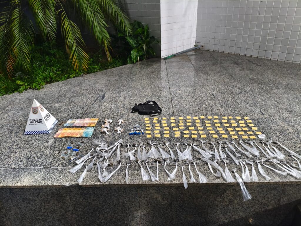 Durante a ação, os policiais apreenderam 80 sacolés e 14 pinos de cocaína, 62 buchas de maconha, 9 porções de skank, 51 pedras de crack e R$ 286 em espécie.