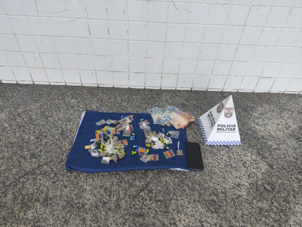 Durante a abordagem, os agentes encontraram com o suspeito R$ 153,50 em espécie e um celular Samsung azul. Na sequência, o cão farejador Draco sinalizou para uma área de vegetação a cerca de 10 metros do ponto da abordagem. No local, os policiais localizaram uma sacola contendo: