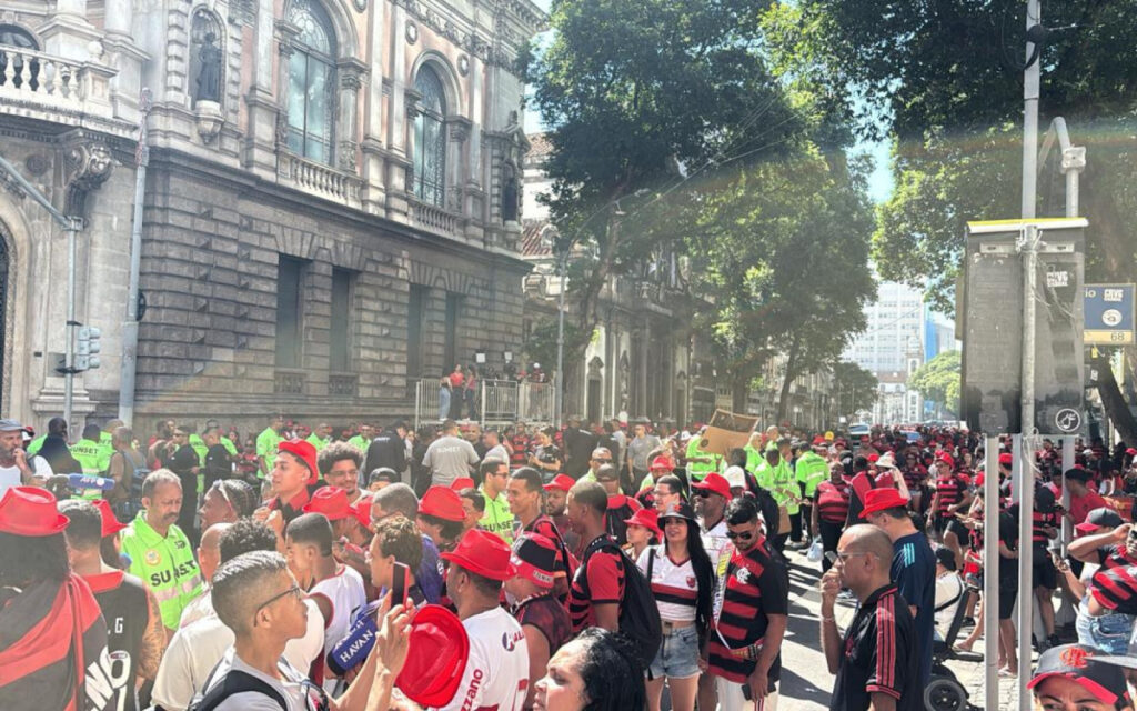 Centenas de torcedores do Flamengo já se deslocaram para a Rua Primeiro de Março, onde está montada a estrutura que levará os tetracampeões da Libertadores por um desfile em um percurso de 850 metros. A interdição do local começou às 5h (de Brasília) e irá até 16h (de Brasília) deste domingo.