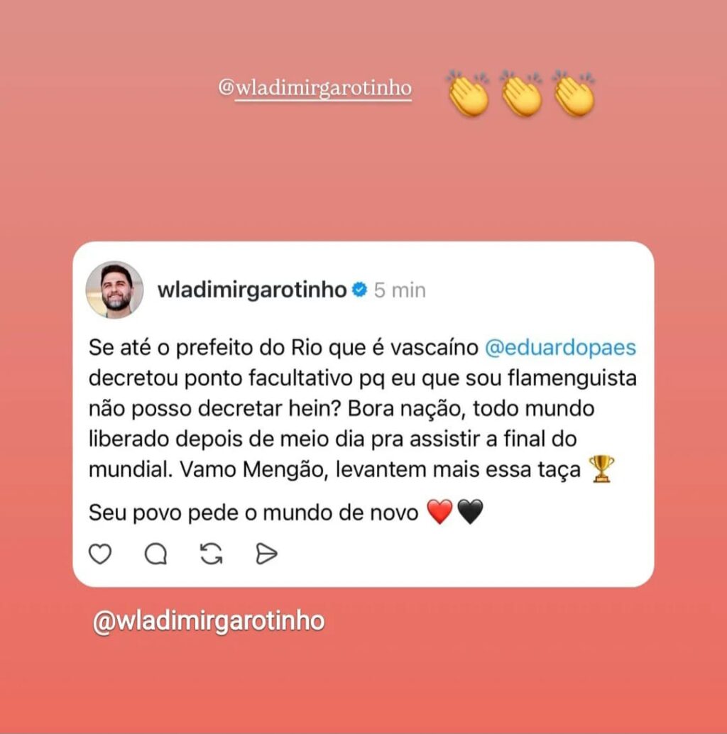 “Bora, Nação! Todo mundo liberado depois de meio-dia para assistir à final do Mundial”, escreveu o prefeito, que ainda demonstrou confiança na conquista do título pelo clube carioca.