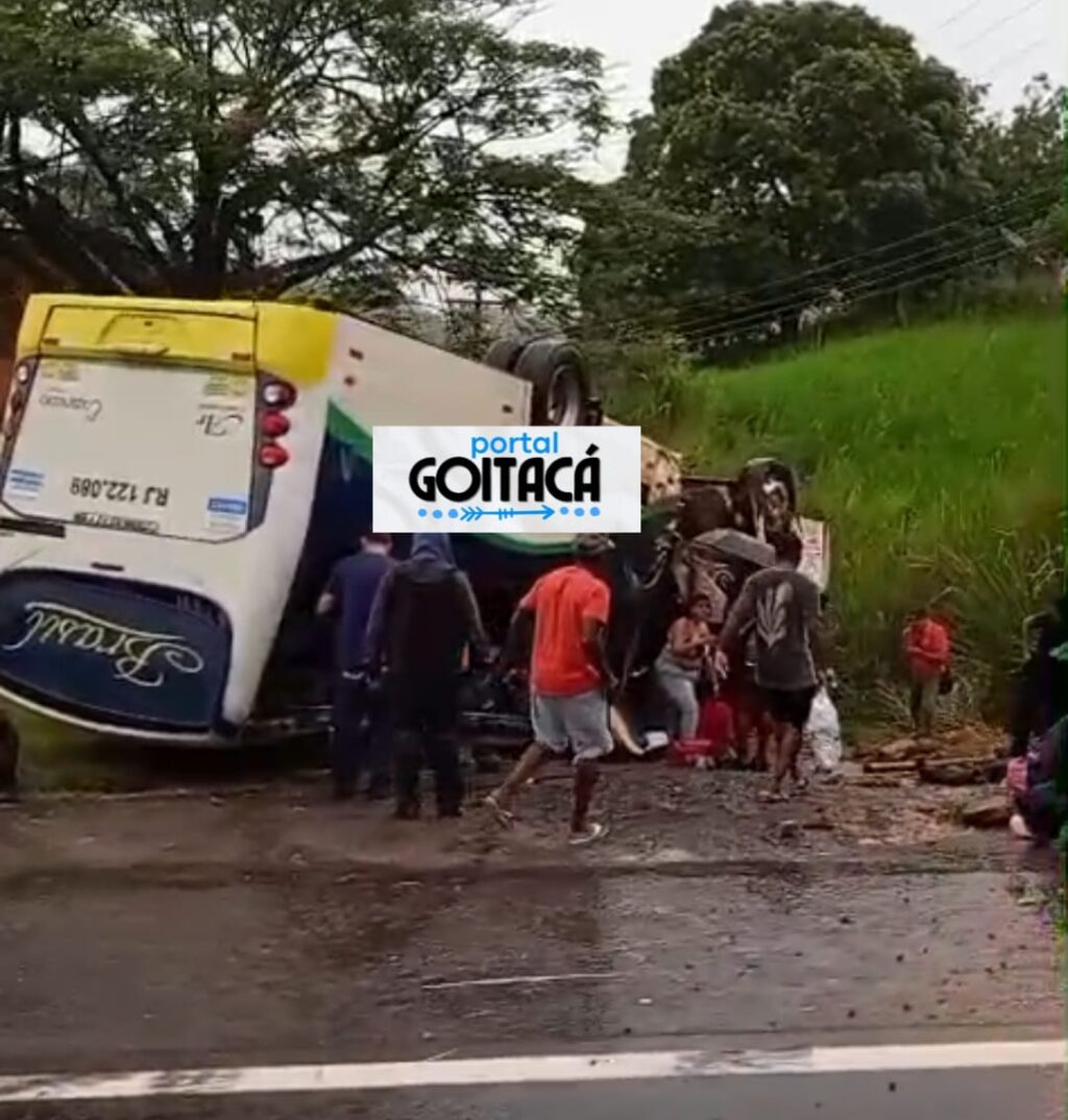 Um ônibus da empresa Brasil tombou na BR-356, na altura do distrito de Retiro do Muriaé, em frente à Escola Municipal da localidade.