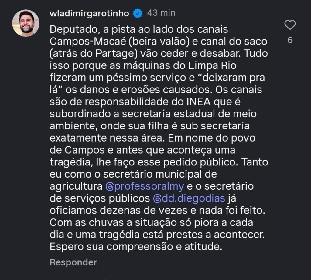A manifestação do prefeito ocorreu exatamente no momento em que o deputado divulgava o programa estadual, o que deu ainda mais visibilidade e peso à cobrança. No comentário, Wladimir alertou para o risco iminente de desabamento da pista localizada às margens do canal Campos–Macaé, conhecido como Beira Valão, e também do Canal do Saco, na área atrás do Partage Shopping, em Campos.