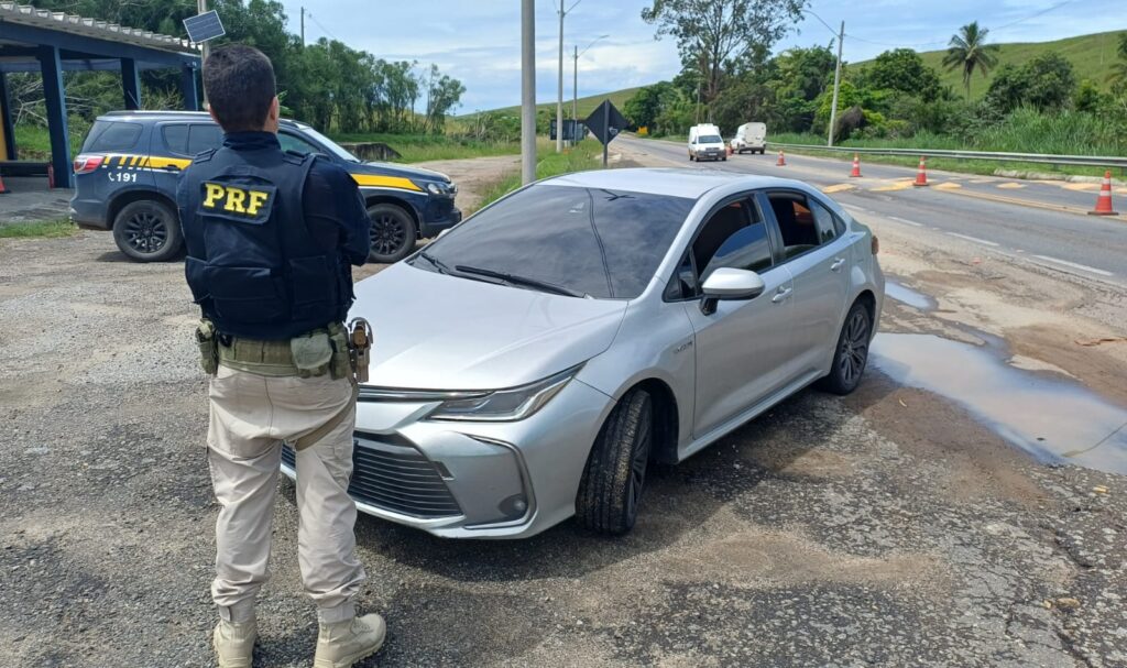 No km 27 da BR-101, em frente ao posto da PRF, a equipe abordou um veículo Toyota Corolla, de cor prata. Na verificação dos equipamentos obrigatórios, foram constatados indícios de alteração em alguns dos elementos de identificação veicular. O condutor, um homem de 40 anos, informou ter adquirido o automóvel recentemente no Rio de Janeiro, porém não apresentou documentação que comprovasse a origem do veículo.