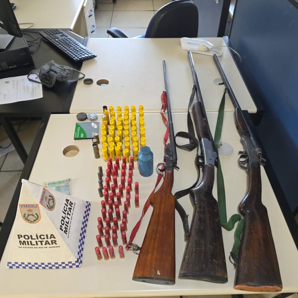 Com autorização da solicitante, os policiais realizaram buscas no imóvel e encontraram três espingardas: uma calibre 20, da marca Boito; uma calibre 36, da marca Lierg, sem numeração; e outra calibre 36, da marca Lerap, também sem numeração. Esta última foi entregue voluntariamente pelo próprio suspeito.