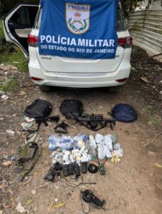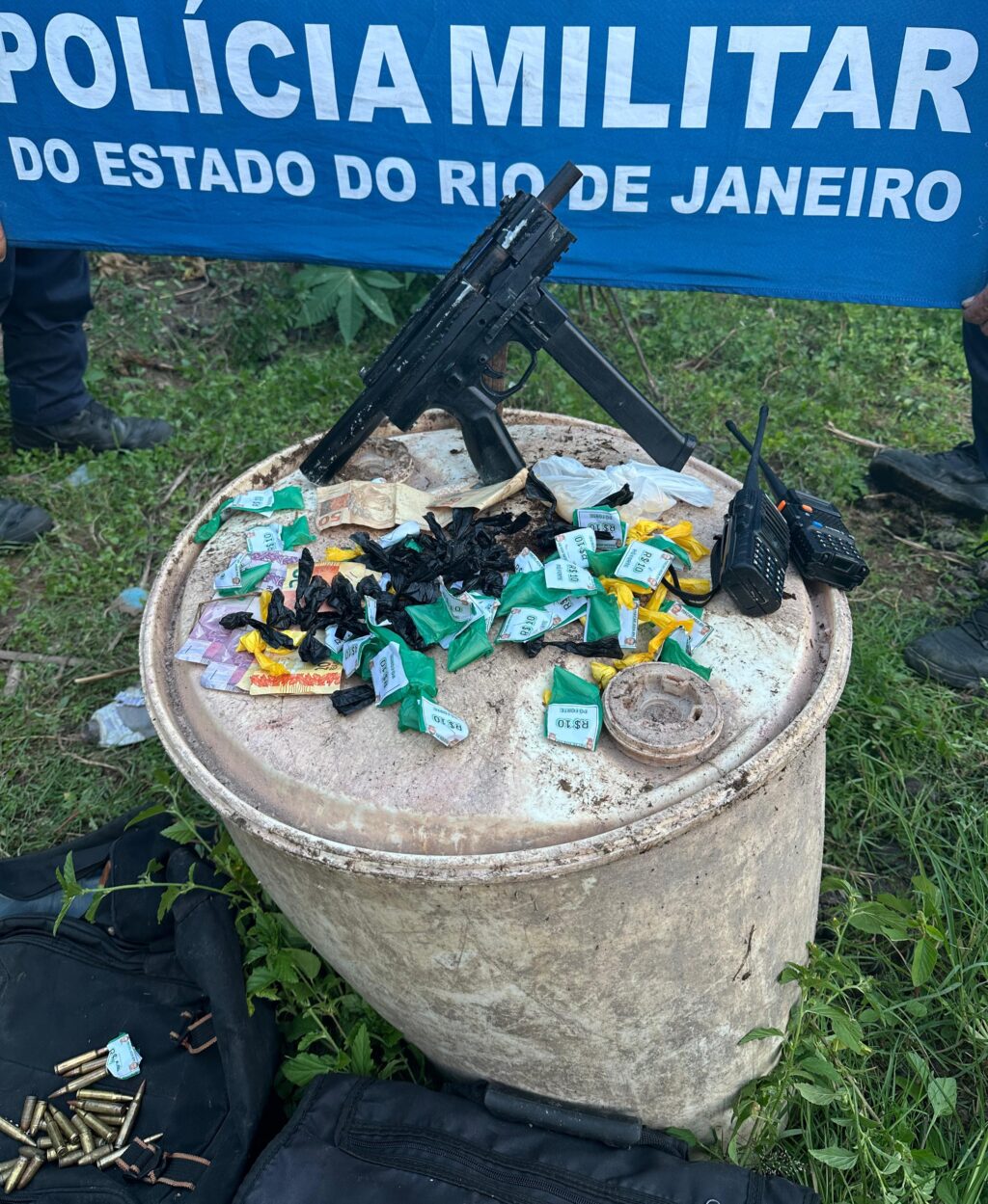 Policiais militares do 32º BPM realizaram uma ação contra o tráfico de drogas, nesta quarta-feira (15), na comunidade das Malvinas, em Macaé, e apreenderam armamento, munições, entorpecentes e equipamentos utilizados por criminosos.